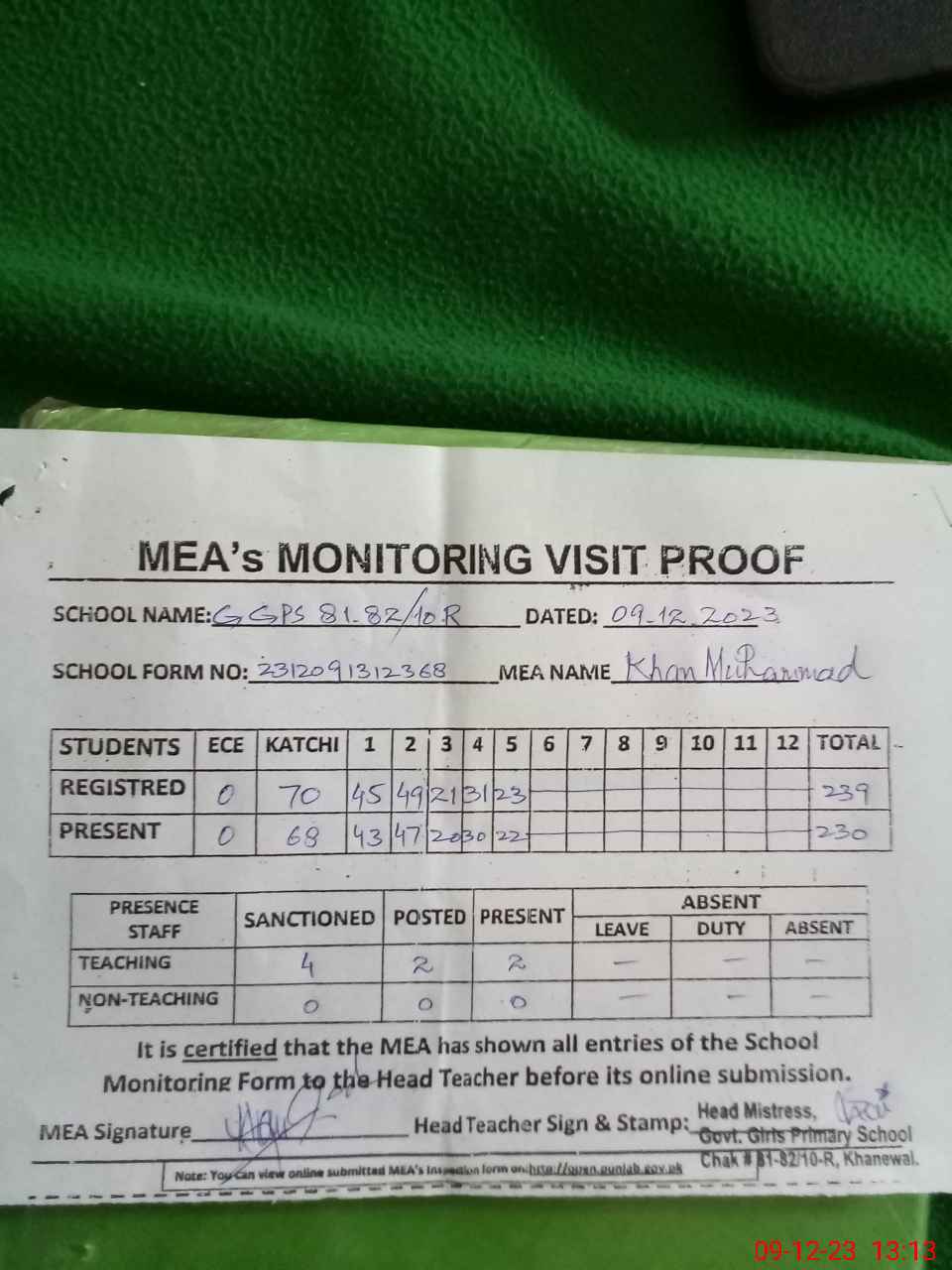 | Attendance Register | Head Teacher | MEA with School | Visit Proof |