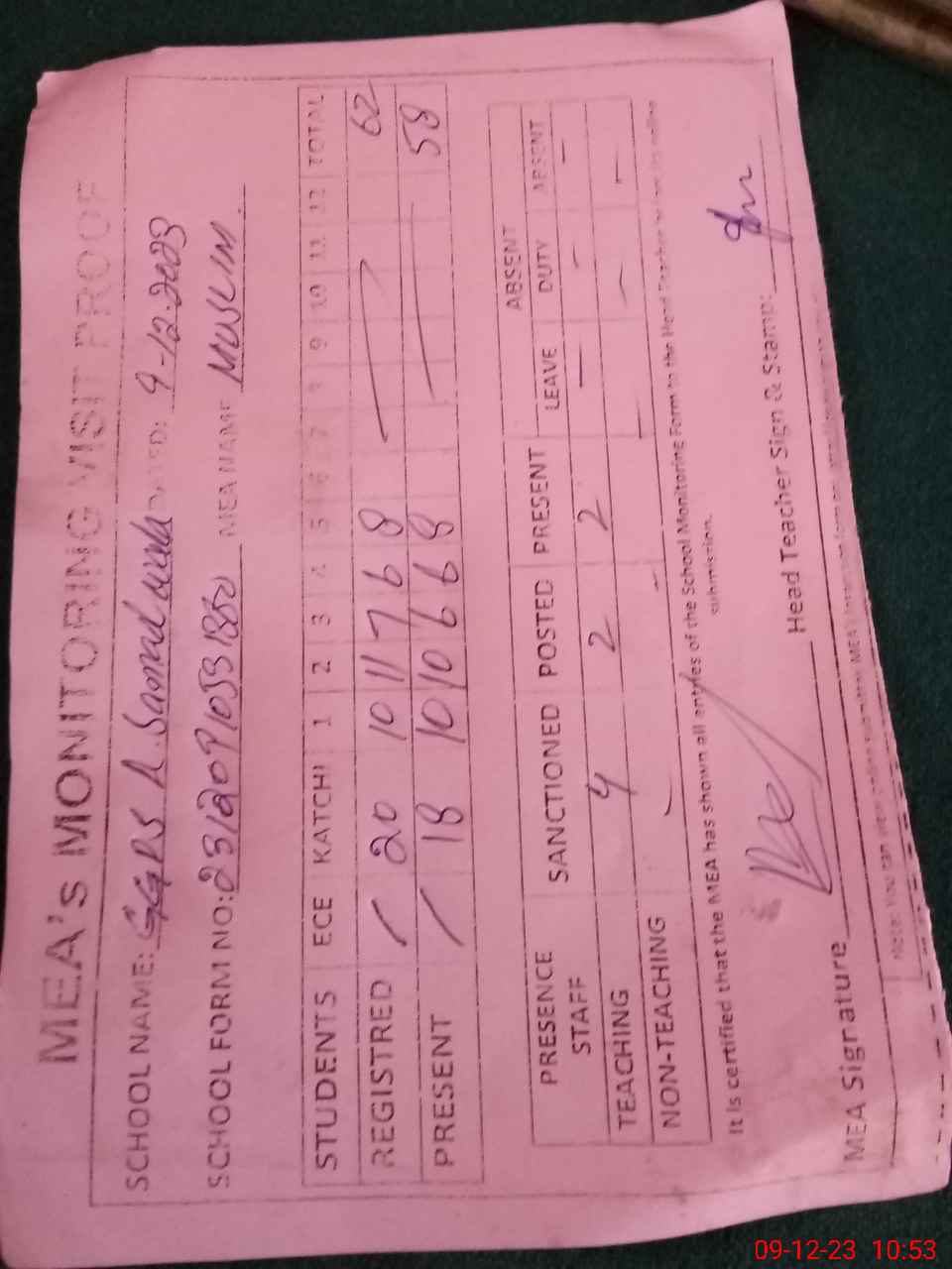 | Attendance Register | Head Teacher | MEA with School | Visit Proof |