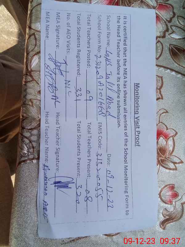 | Attendance Register | Head Teacher | MEA with School | Visit Proof |