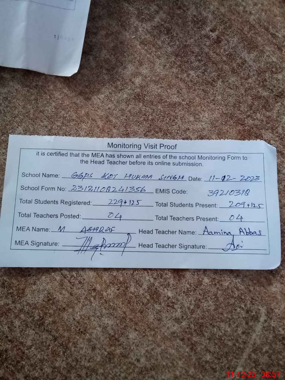 | EMIS Code: 39210318 | Name of School: GGPS KOT HUKAM SINGH | |||