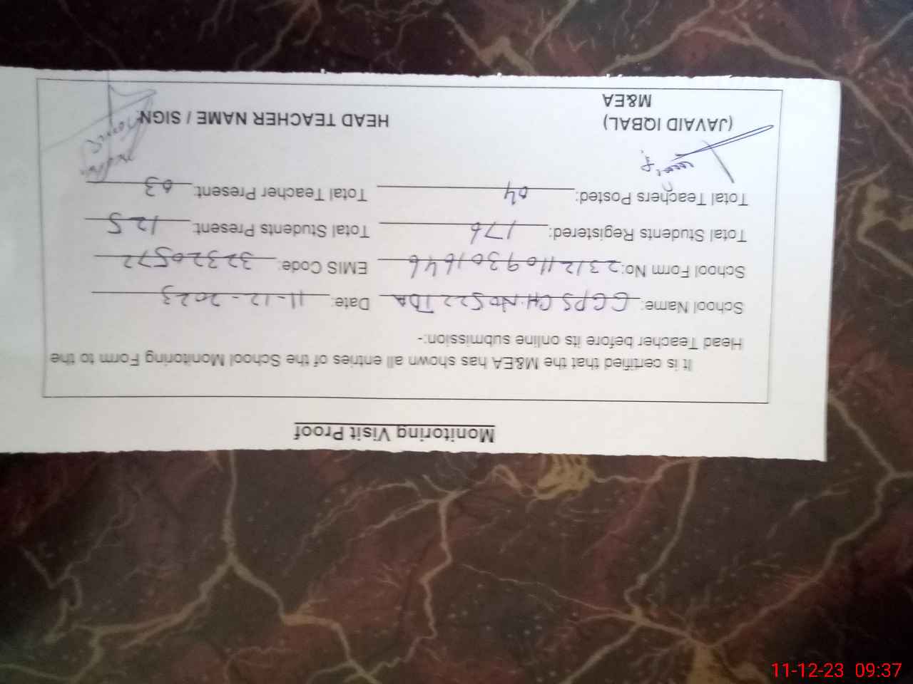 | Certified that this School was Inspected by the Undersigned MEA/DMO Today and the Information Stated Above is as Per Record. | |||||