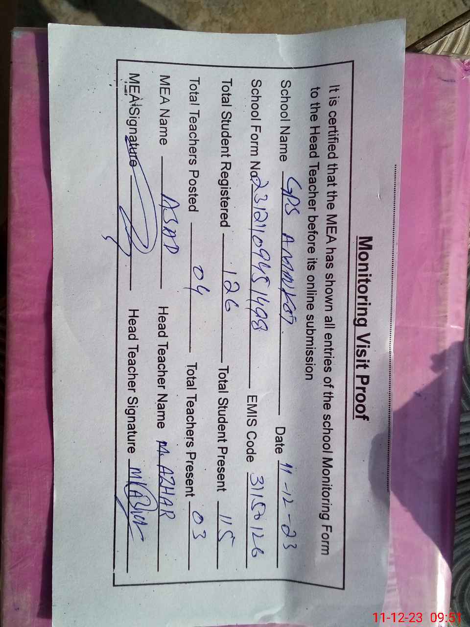 | Attendance Register | Head Teacher | MEA with School | Visit Proof |