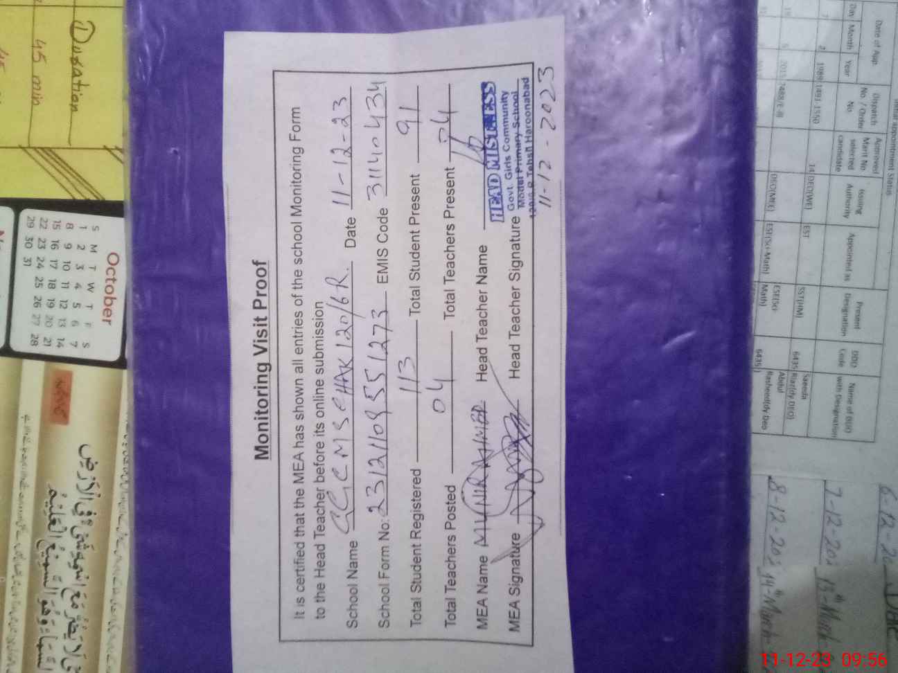 | Attendance Register | Head Teacher | MEA with School | Visit Proof |