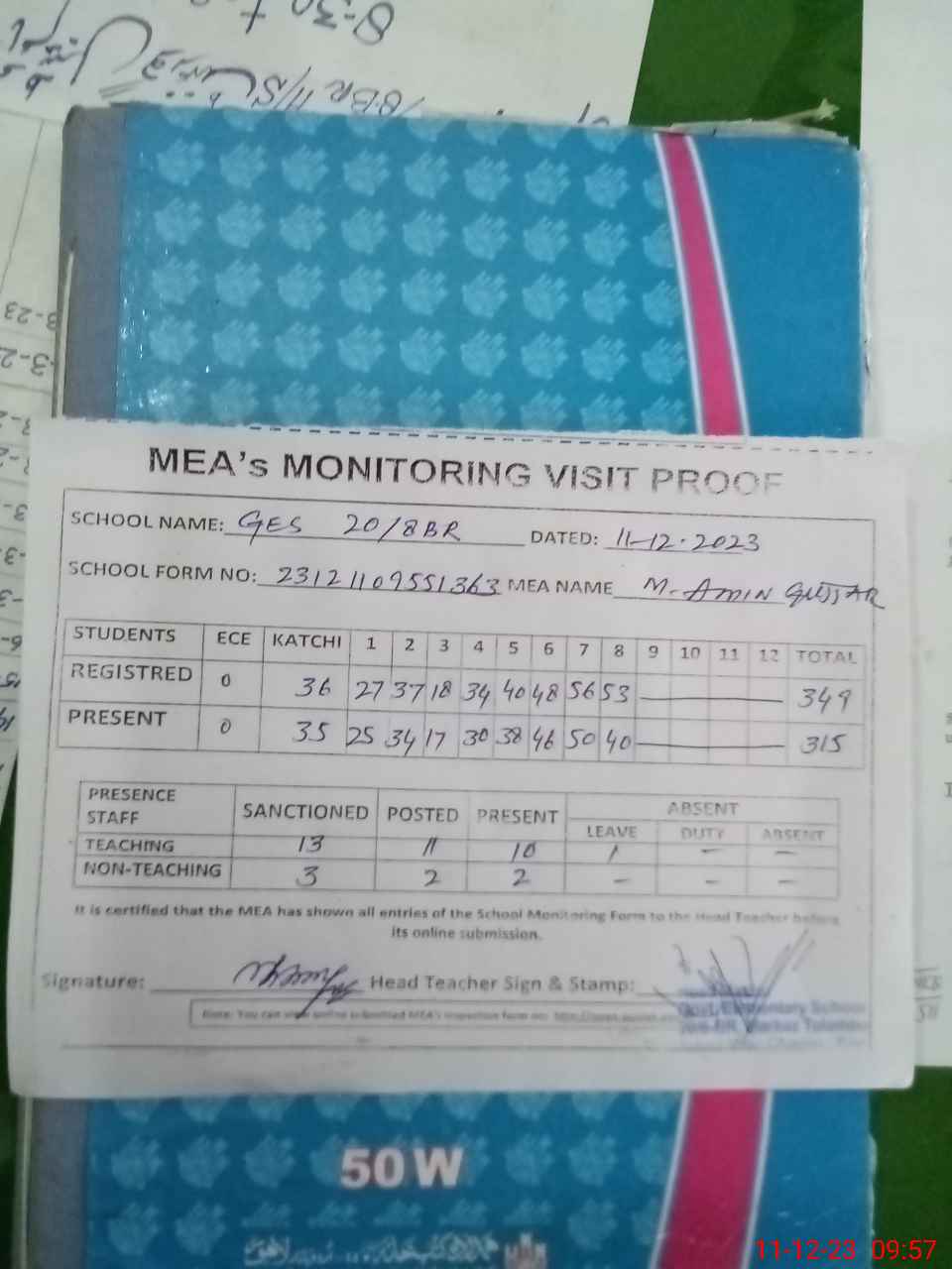 | Attendance Register | Head Teacher | MEA with School | Visit Proof |