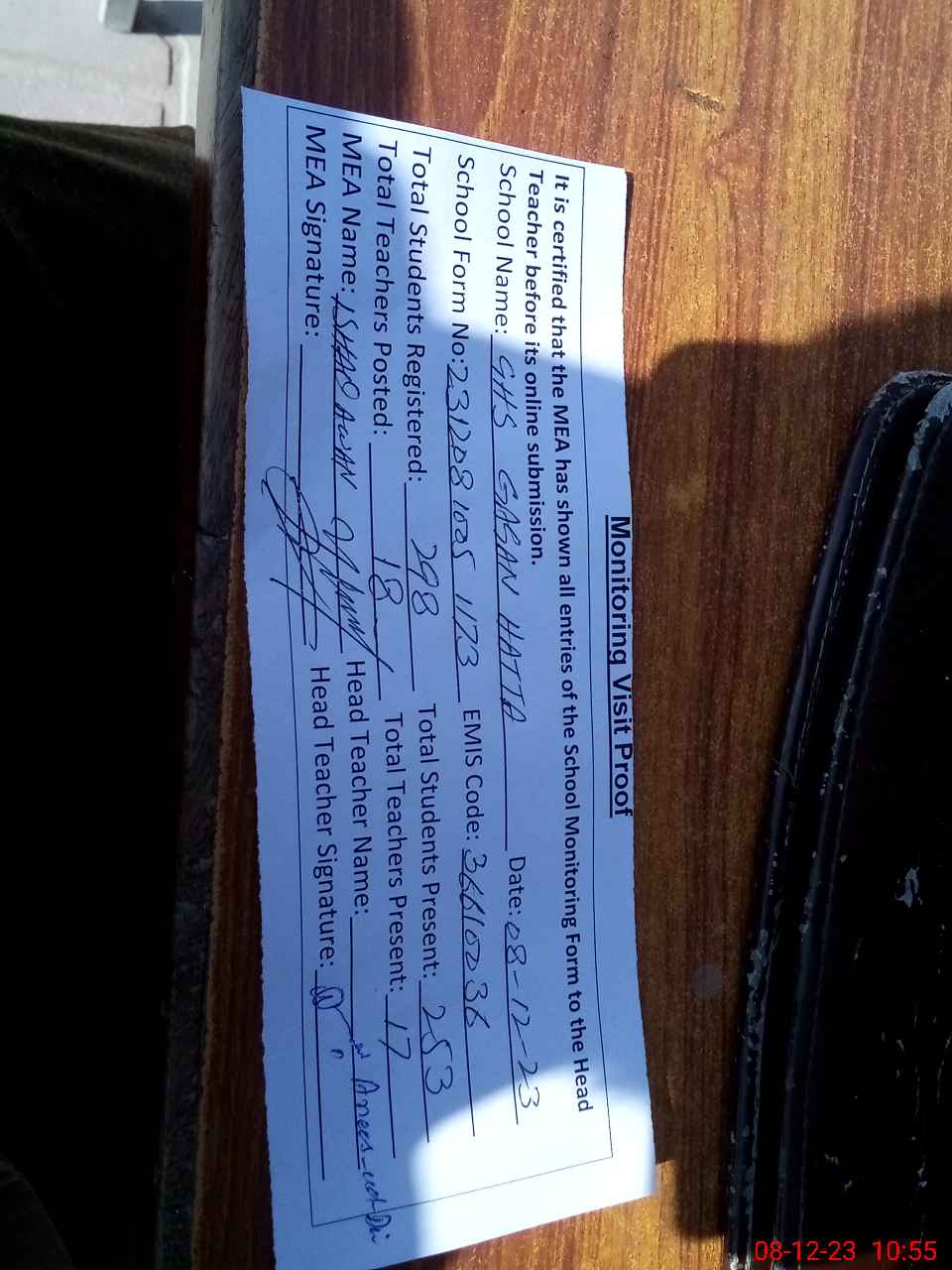 | Attendance Register | Head Teacher | MEA with School | Visit Proof |