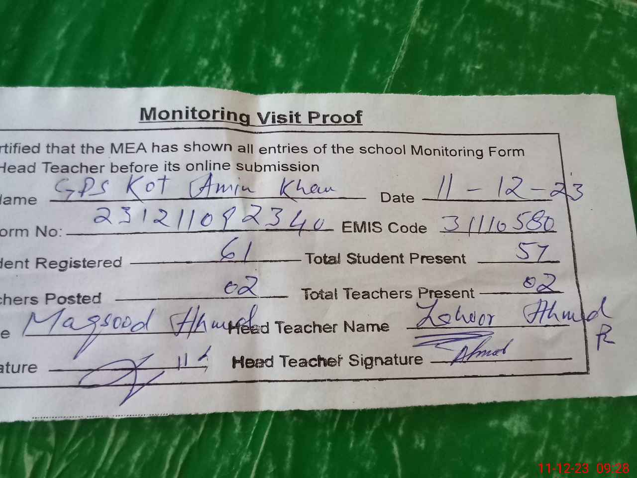 | Attendance Register | Head Teacher | MEA with School | Visit Proof |