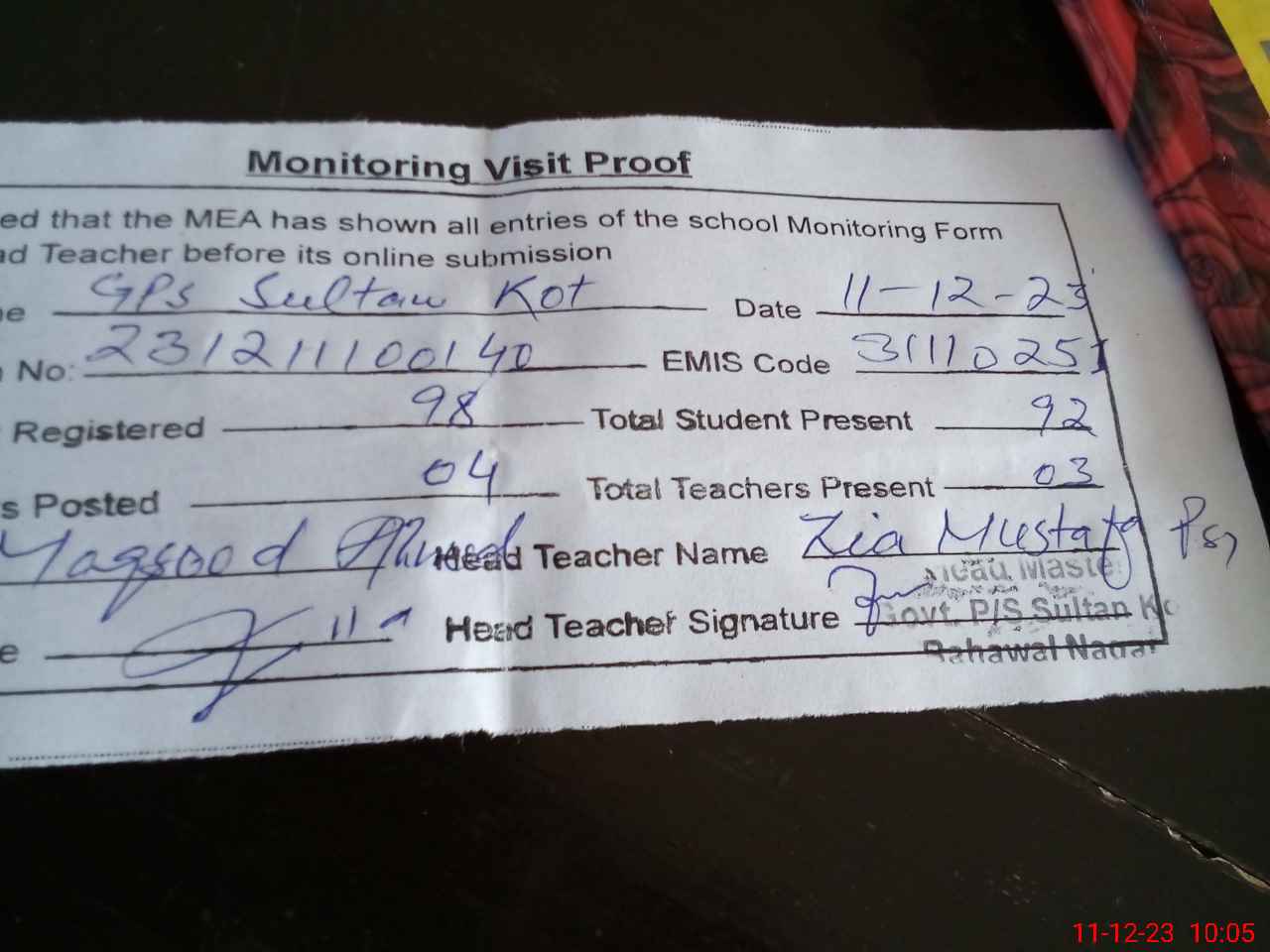 | EMIS Code: 31110251 | Name of School: GPS SULTAN KOT | |||