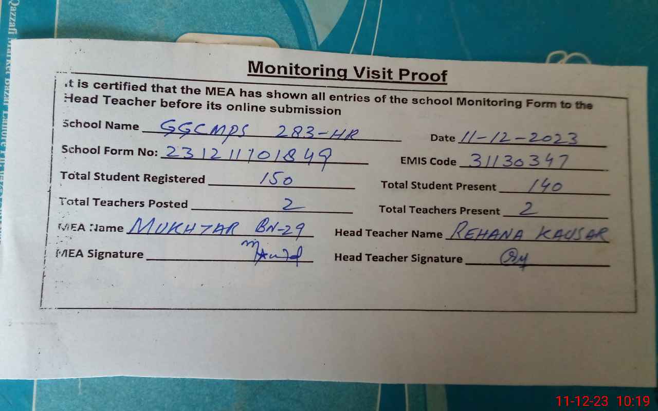 | EMIS Code: 31130347 | Name of School: GGCMPS CHAK NO 283 HR | |||