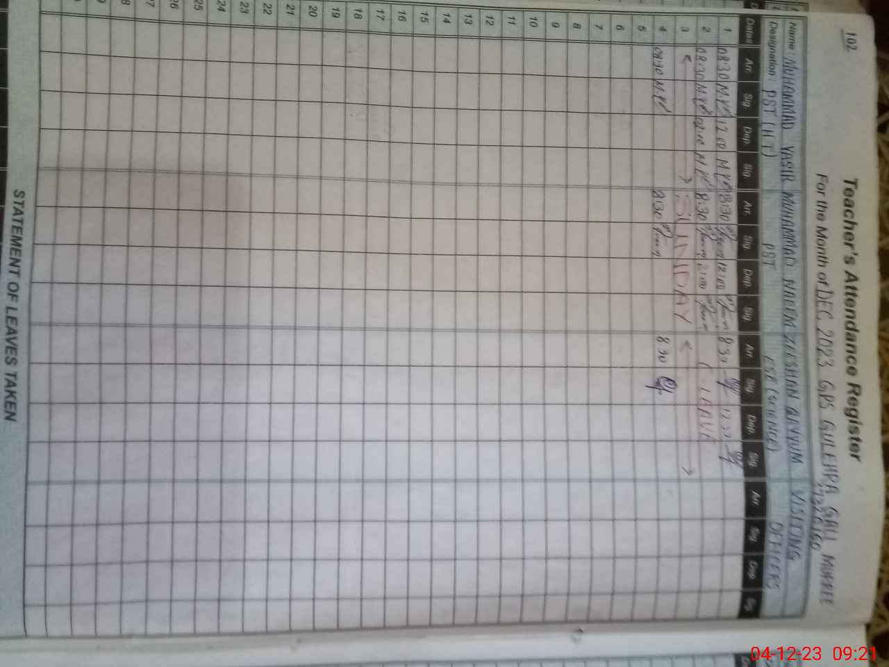 | CNIC | Full Name | Designation | R/C | Absence During Last Calender Month |