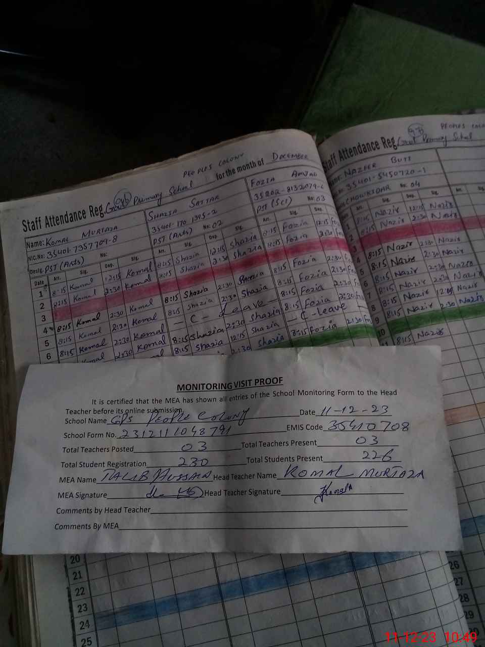 | Attendance Register | Head Teacher | MEA with School | Visit Proof |