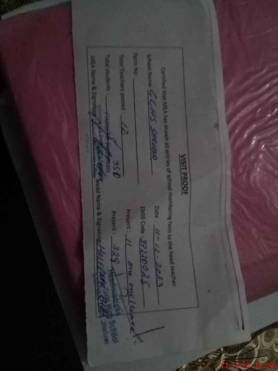 | Attendance Register | Head Teacher | MEA with School | Visit Proof |