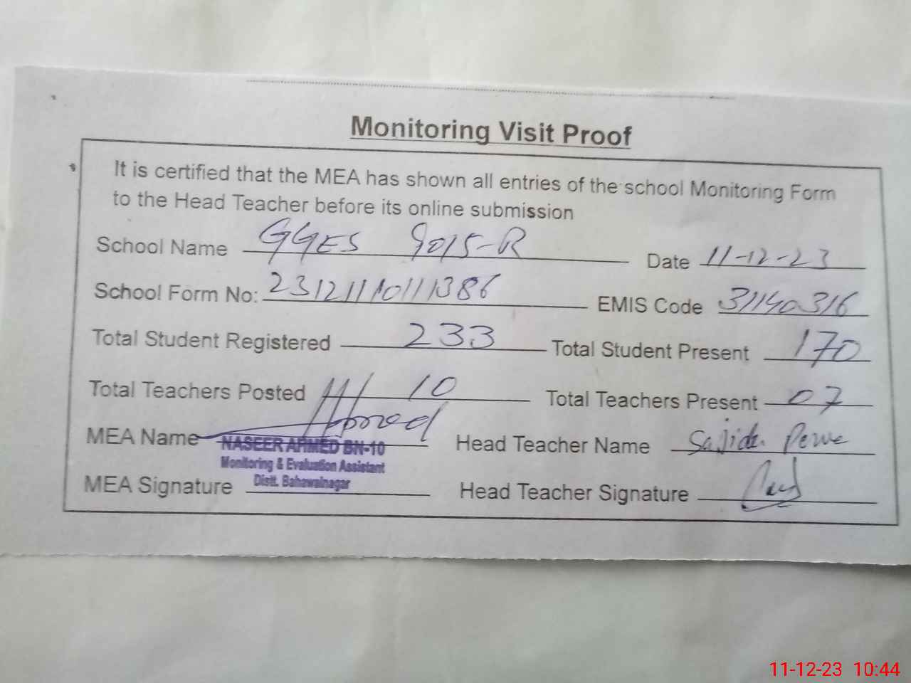 | Attendance Register | Head Teacher | MEA with School | Visit Proof |