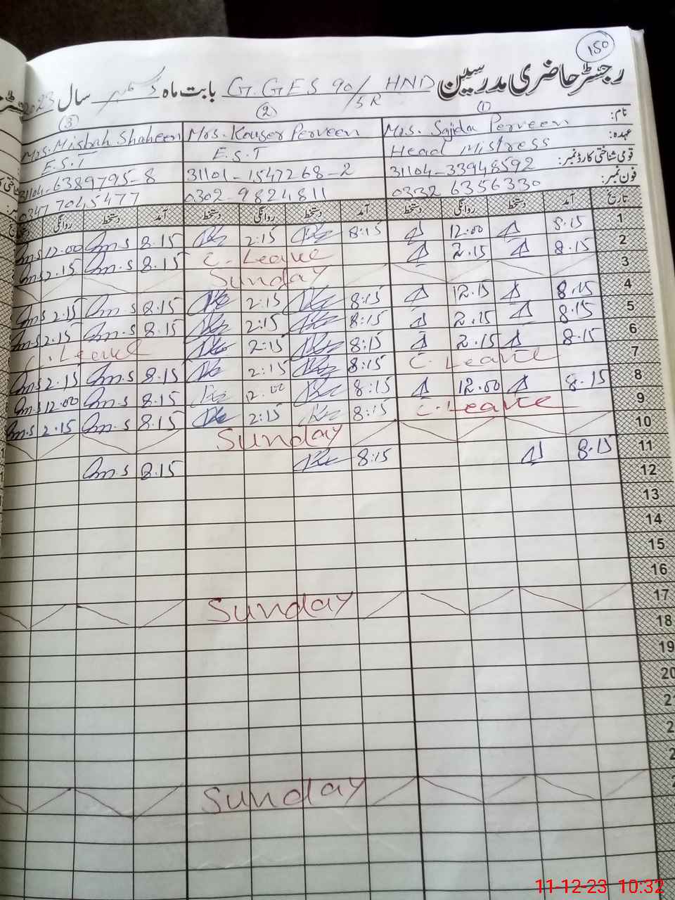 | CNIC | Full Name | Designation | R/C | Absence During Last Calender Month |