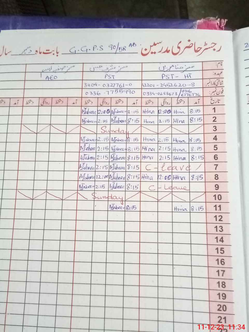 | CNIC | Full Name | Designation | R/C | Absence During Last Calender Month |