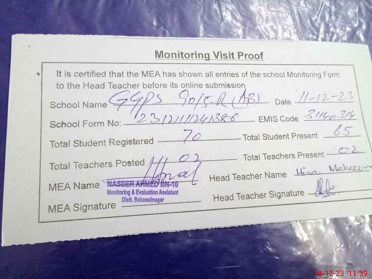 | Attendance Register | Head Teacher | MEA with School | Visit Proof |