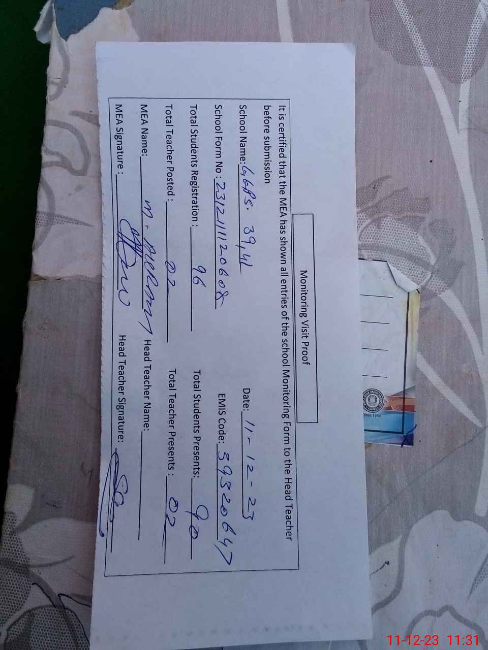 | Attendance Register | Head Teacher | MEA with School | Visit Proof |