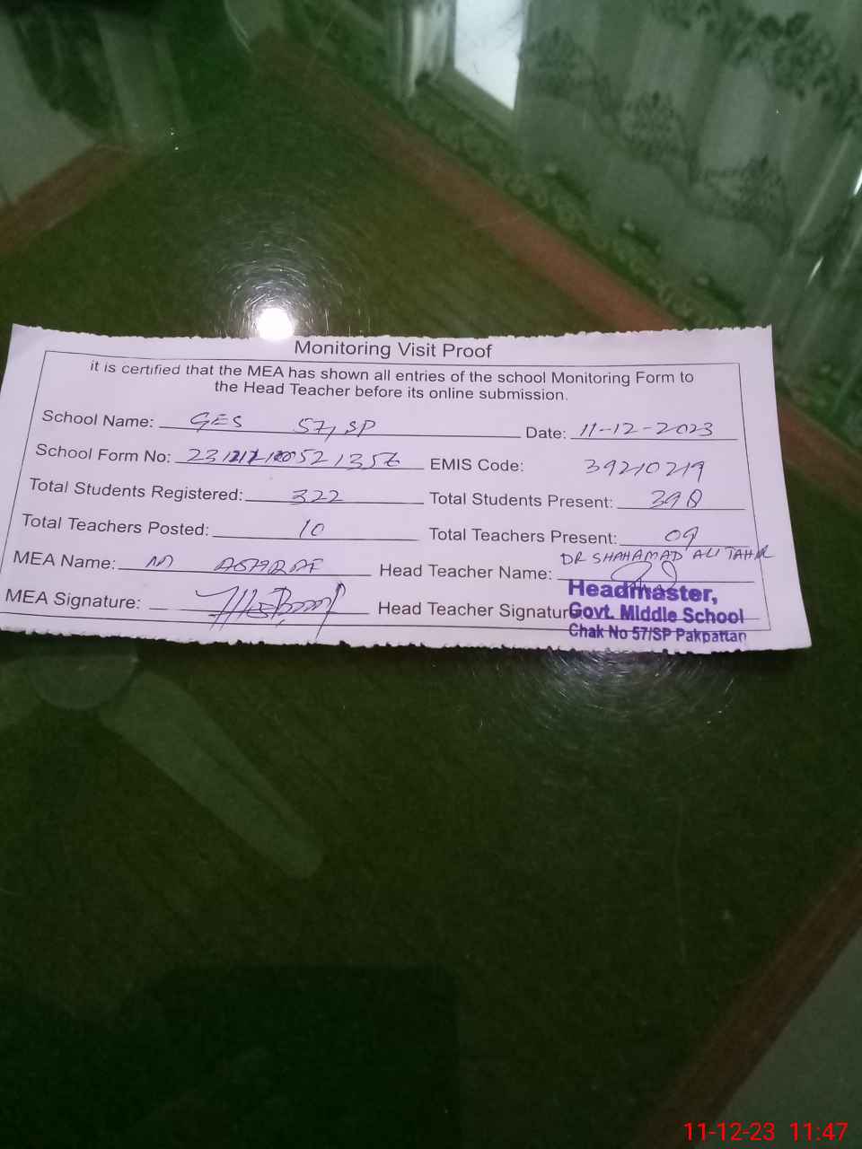 | Attendance Register | Head Teacher | MEA with School | Visit Proof |