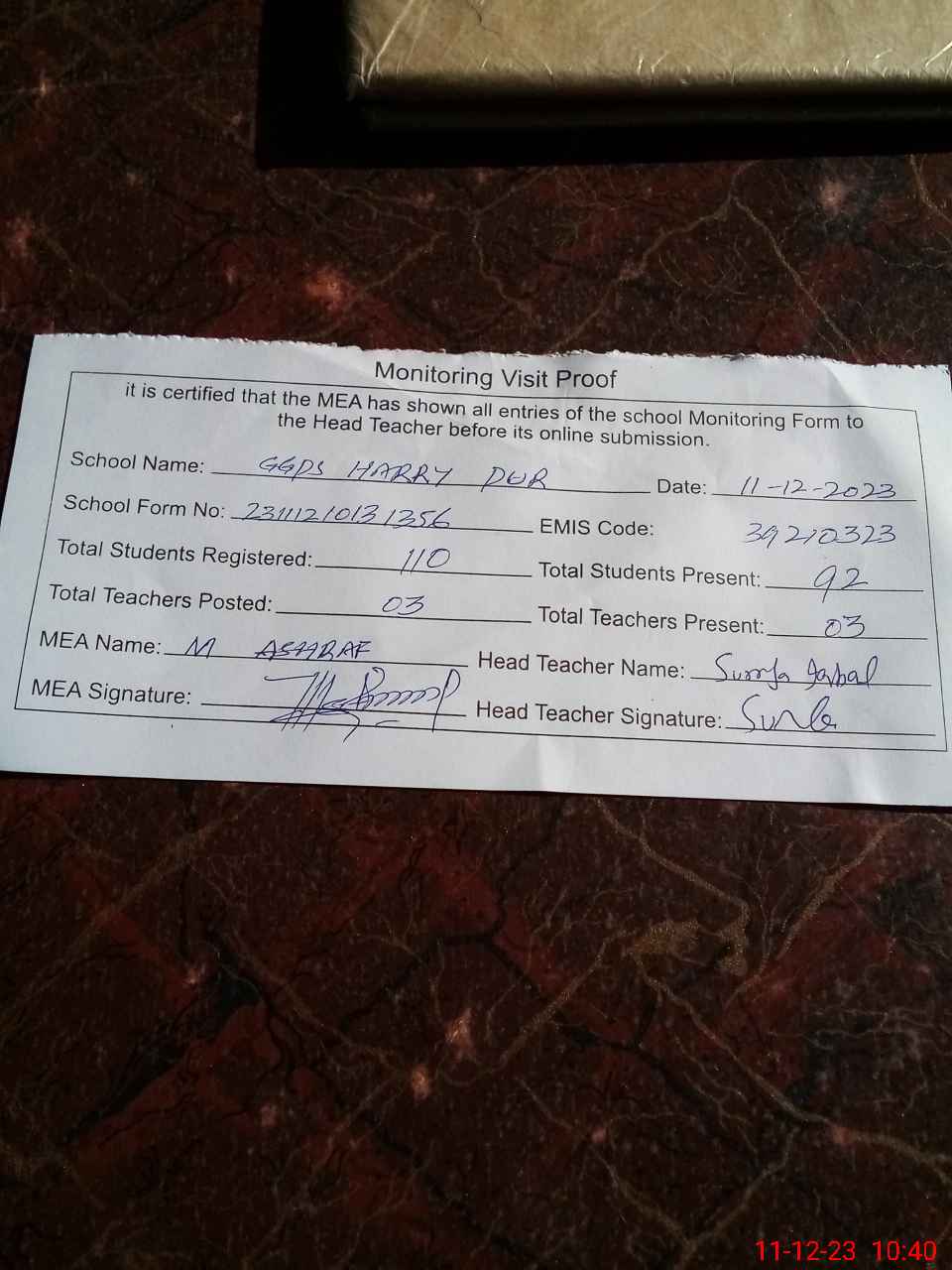 | Attendance Register | Head Teacher | MEA with School | Visit Proof |
