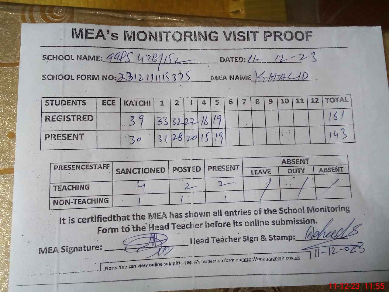 | Attendance Register | Head Teacher | MEA with School | Visit Proof |