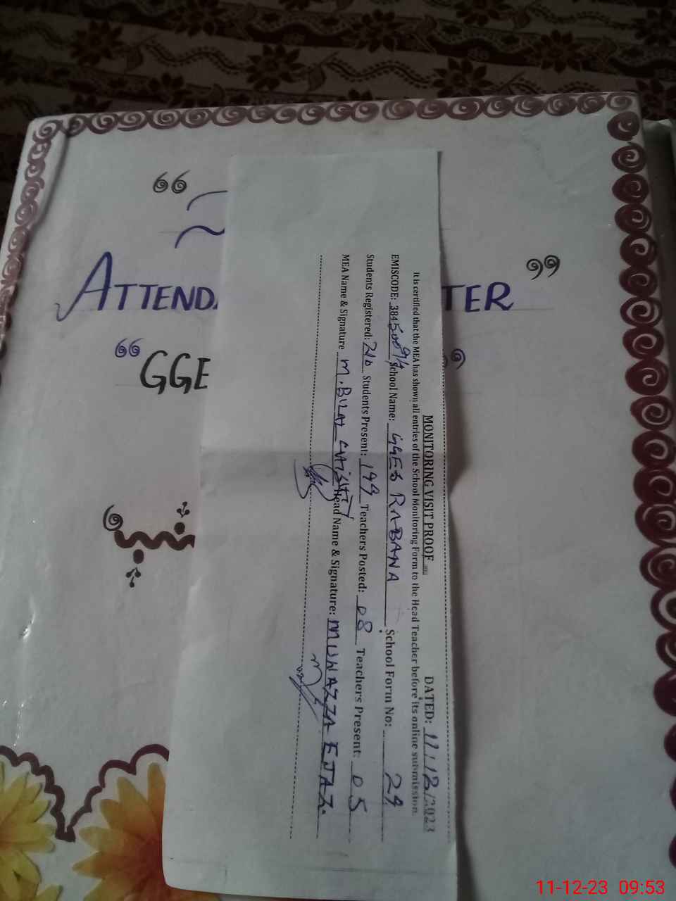 | Attendance Register | Head Teacher | MEA with School | Visit Proof |