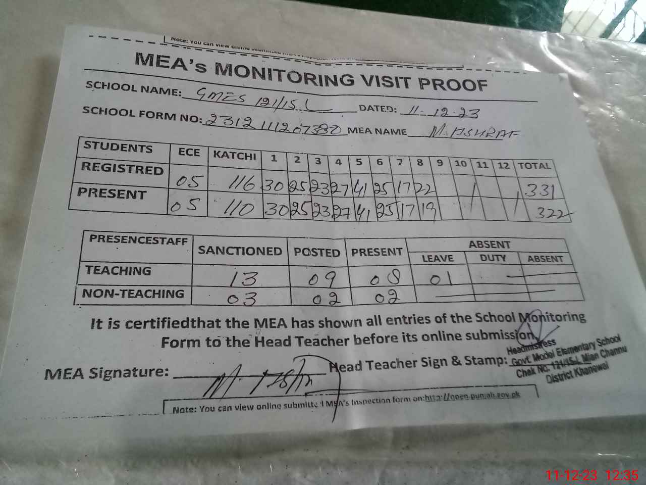 | Attendance Register | Head Teacher | MEA with School | Visit Proof |
