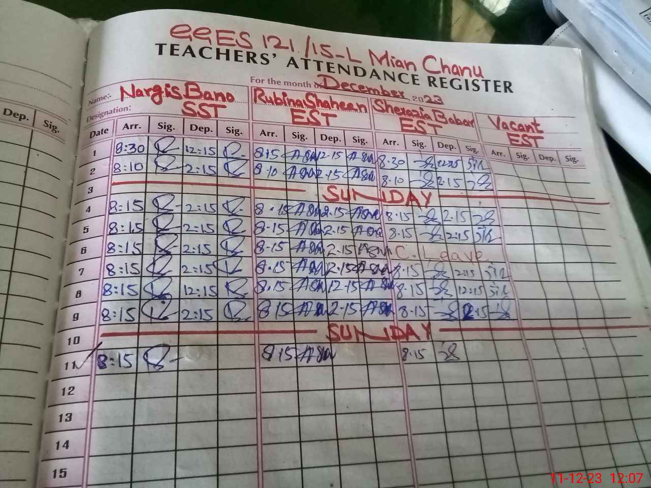 | CNIC | Full Name | Designation | R/C | Absence During Last Calender Month |