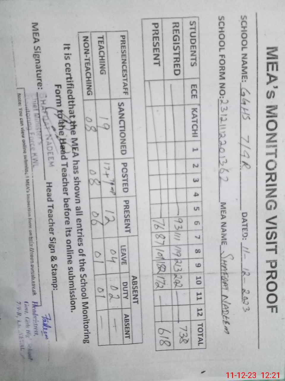 | Attendance Register | Head Teacher | MEA with School | Visit Proof |