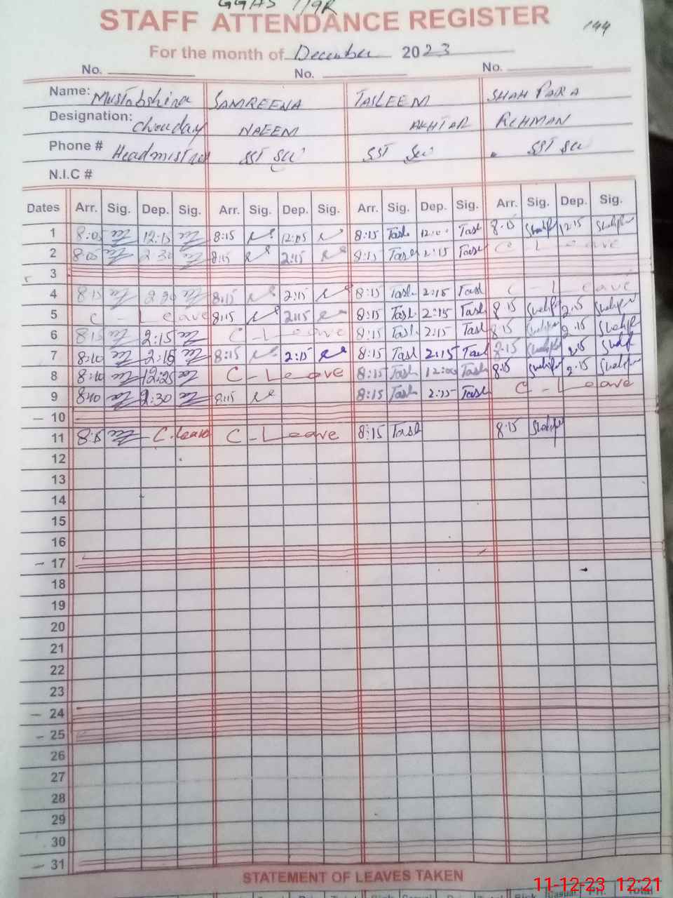 | CNIC | Full Name | Designation | R/C | Absence During Last Calender Month |