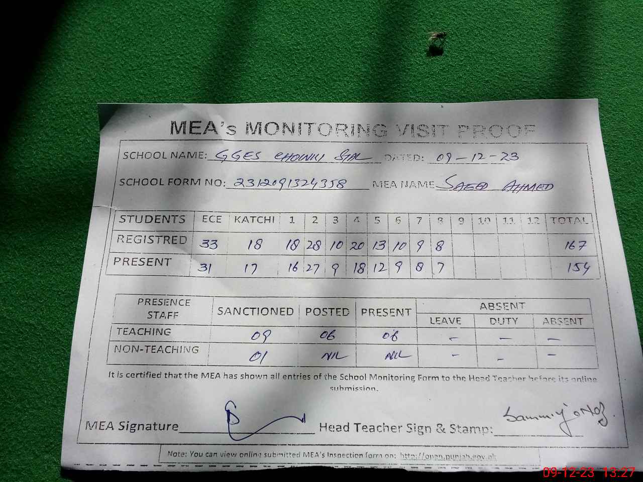| Attendance Register | Head Teacher | MEA with School | Visit Proof |