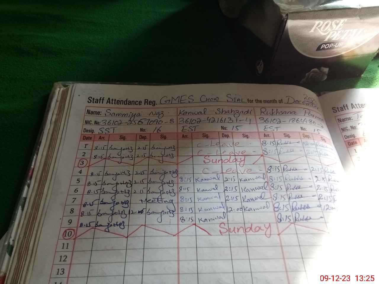 | CNIC | Full Name | Designation | R/C | Absence During Last Calender Month |