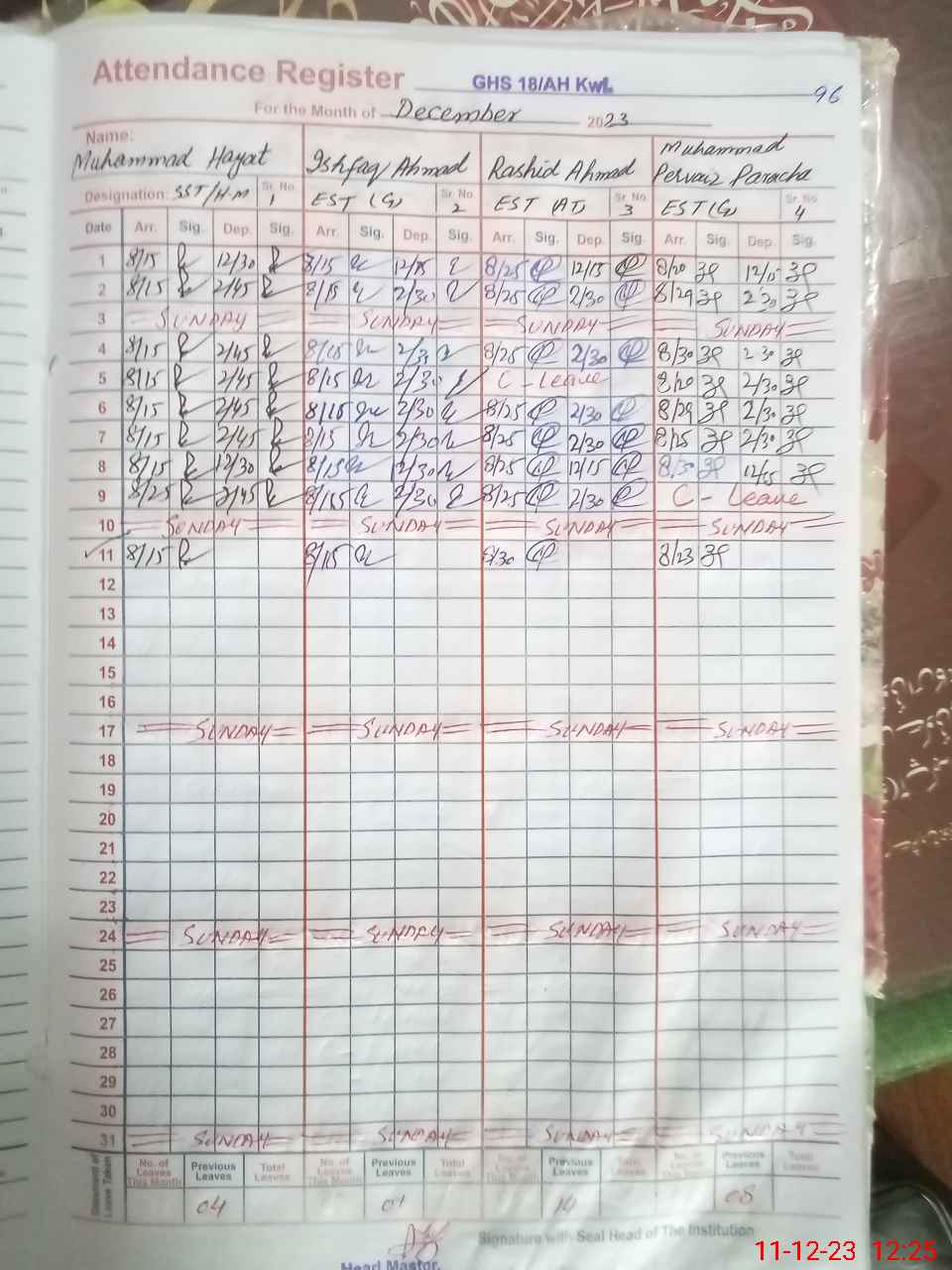 | CNIC | Full Name | Designation | R/C | Absence During Last Calender Month |