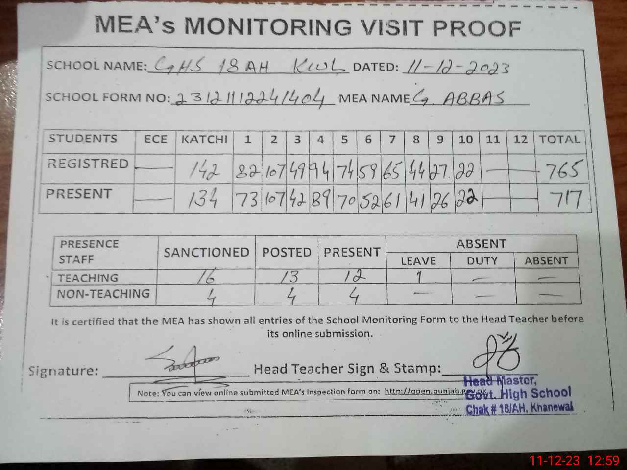 | Attendance Register | Head Teacher | MEA with School | Visit Proof |