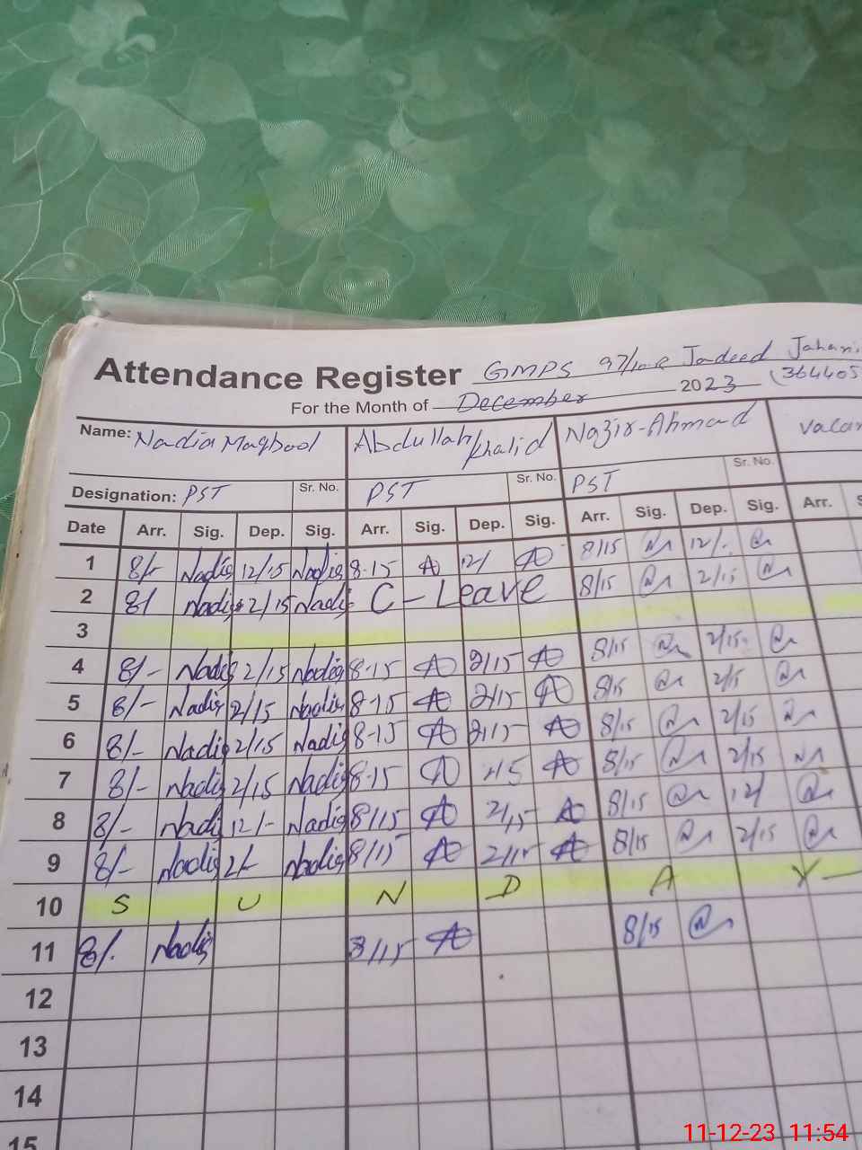 | CNIC | Full Name | Designation | R/C | Absence During Last Calender Month |