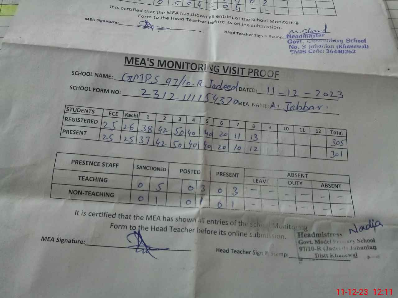 | Attendance Register | Head Teacher | MEA with School | Visit Proof |