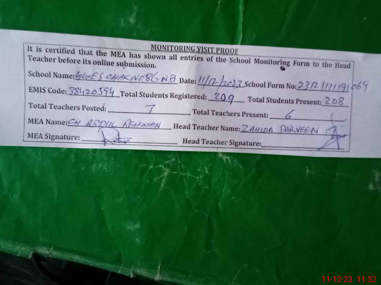 | Attendance Register | Head Teacher | MEA with School | Visit Proof |