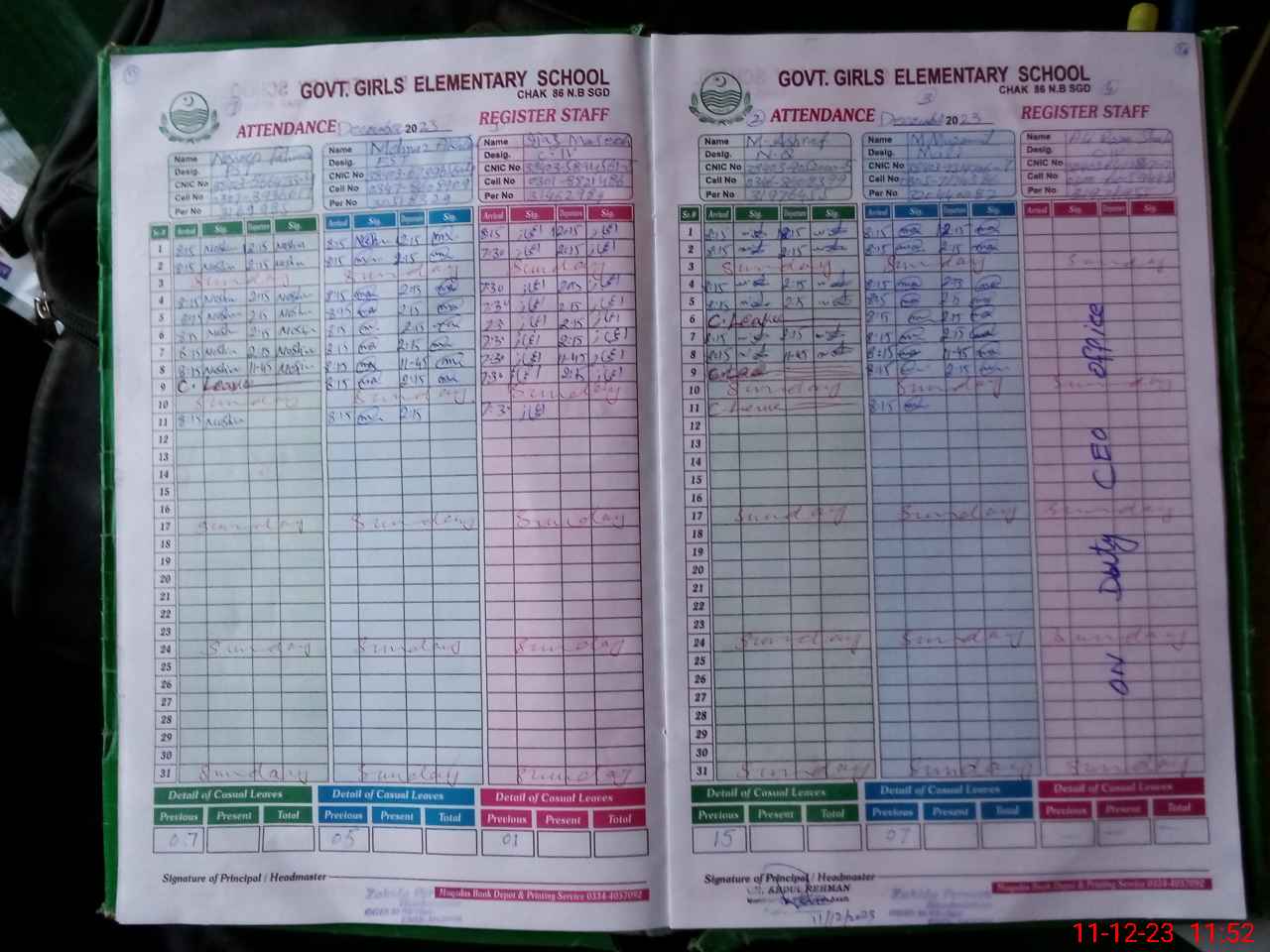 | CNIC | Full Name | Designation | R/C | Absence During Last Calender Month |