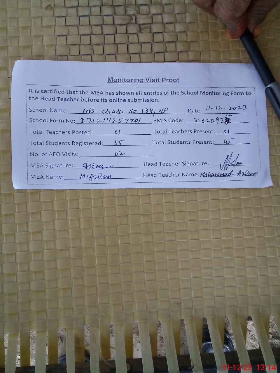 | Attendance Register | Head Teacher | MEA with School | Visit Proof |