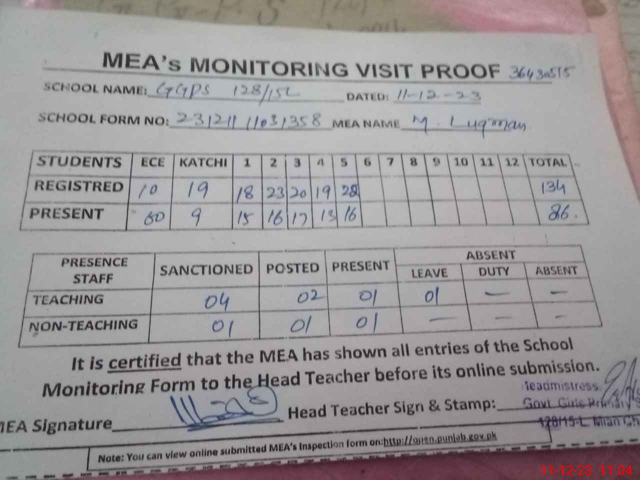 | Monitoring Date: 11-12-2023 | Start Time: 11-12-2023 10:34 AM | End Time: 11-12-2023 11:07 AM | Name of MEA: Mu**** Lu**** | |