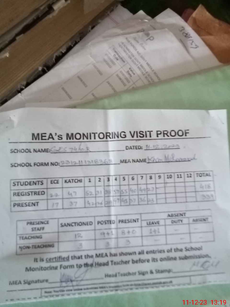 | Attendance Register | Head Teacher | MEA with School | Visit Proof |