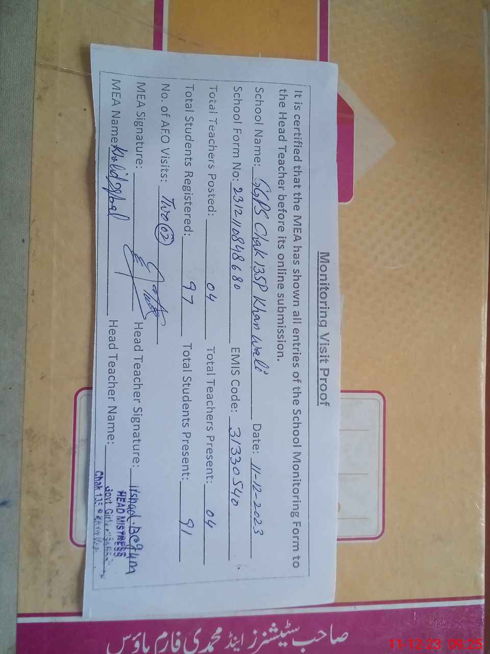 | EMIS Code: 31330540 | Name of School: GGPS CHAK 135/P KHAN WALI | |||