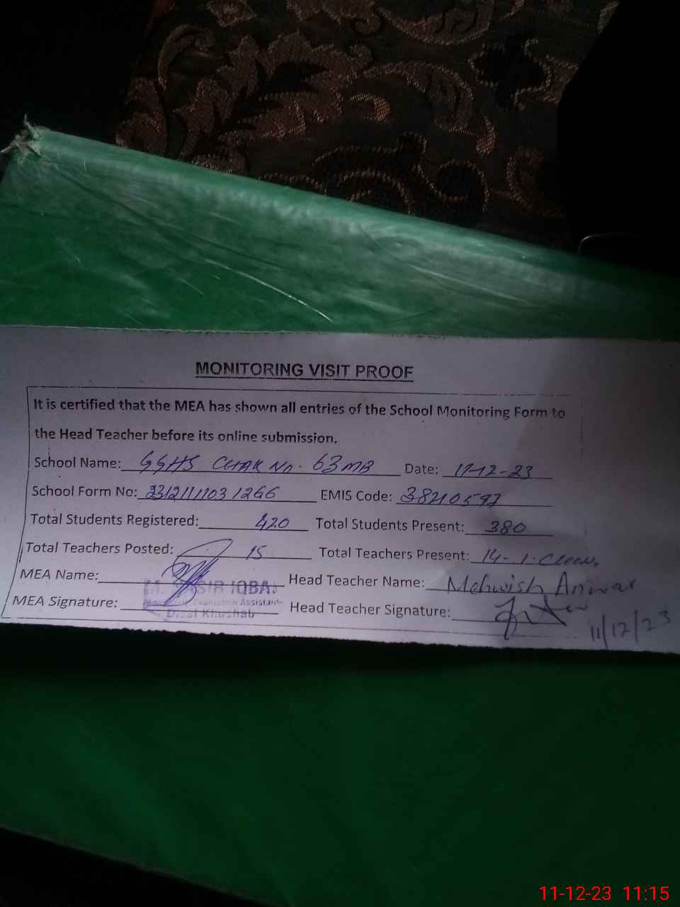 | Attendance Register | Head Teacher | MEA with School | Visit Proof |