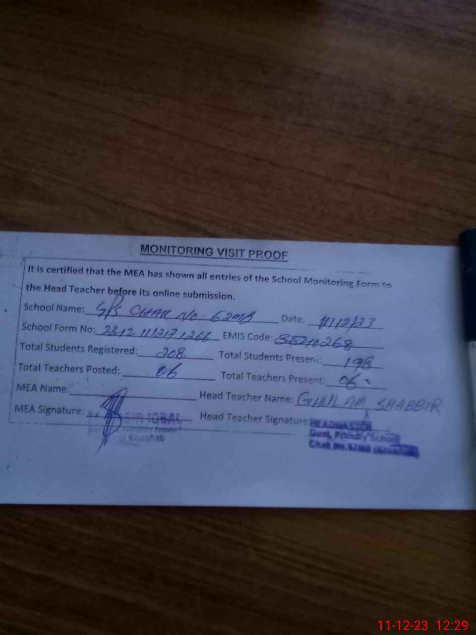 | Attendance Register | Head Teacher | MEA with School | Visit Proof |