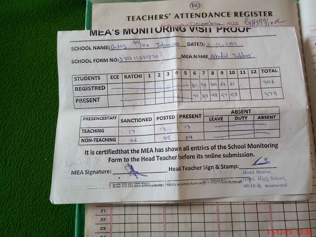 | Attendance Register | Head Teacher | MEA with School | Visit Proof |