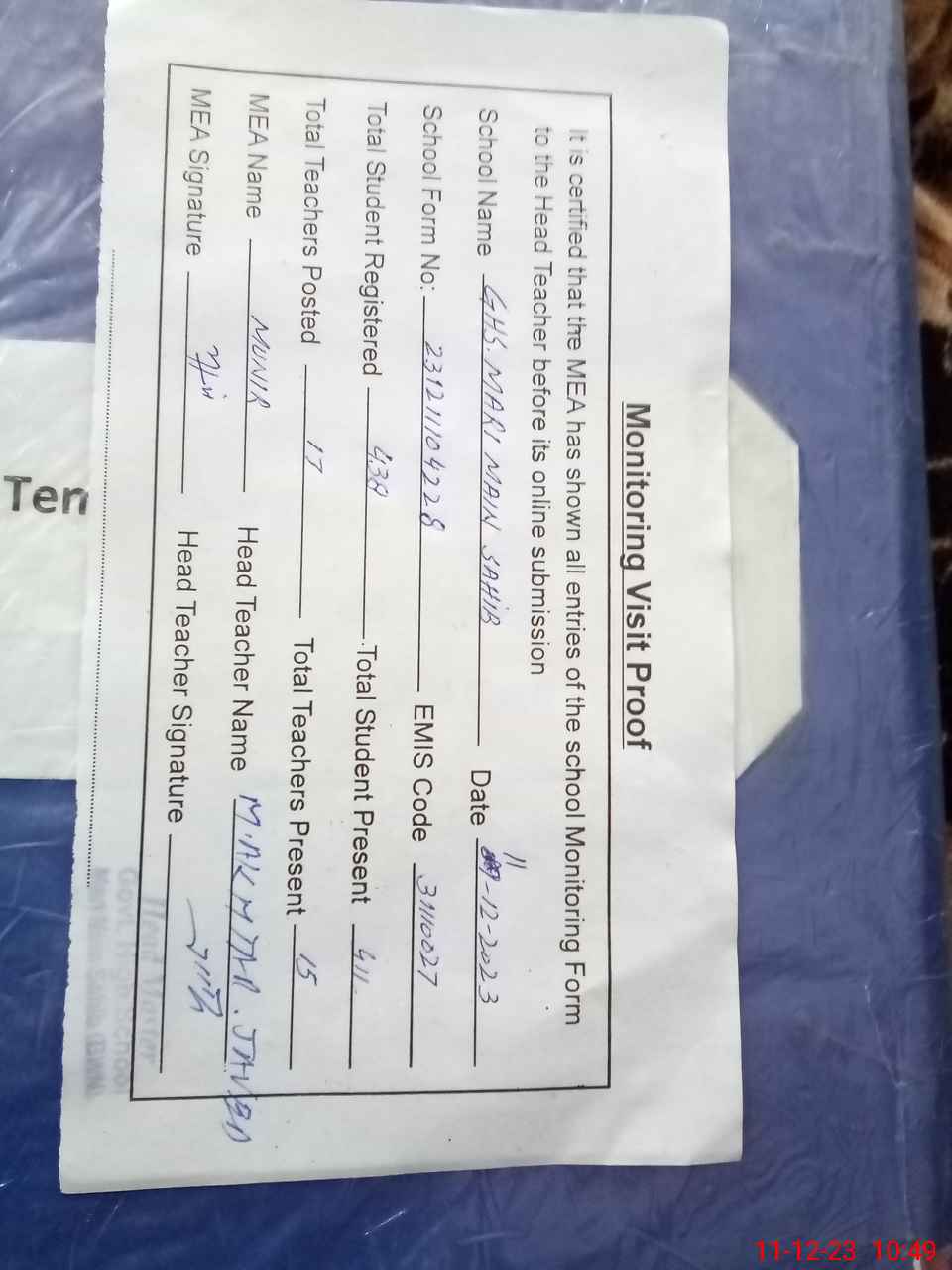 | Certified that this School was Inspected by the Undersigned MEA/DMO Today and the Information Stated Above is as Per Record. | |||||