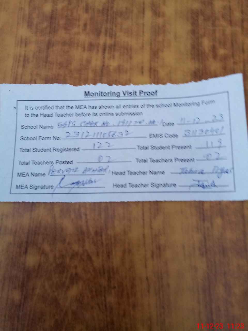| Attendance Register | Head Teacher | MEA with School | Visit Proof |