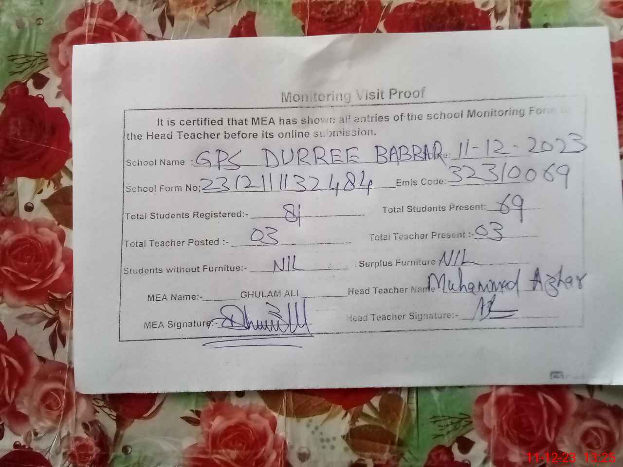 | Attendance Register | Head Teacher | MEA with School | Visit Proof |