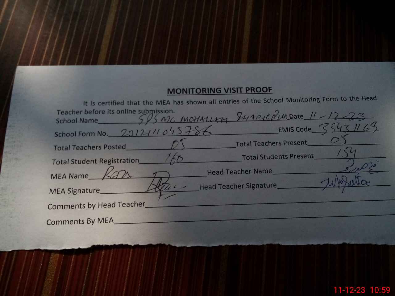 | Attendance Register | Head Teacher | MEA with School | Visit Proof |