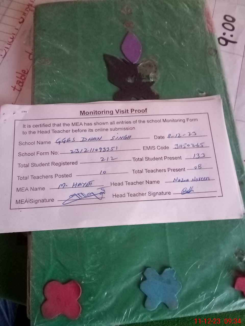 | Attendance Register | Head Teacher | MEA with School | Visit Proof |