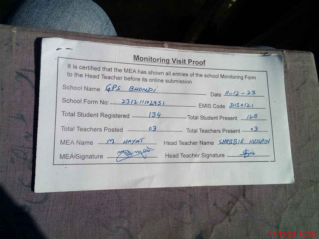 | EMIS Code: 31150121 | Name of School: GPS BHONDI | |||