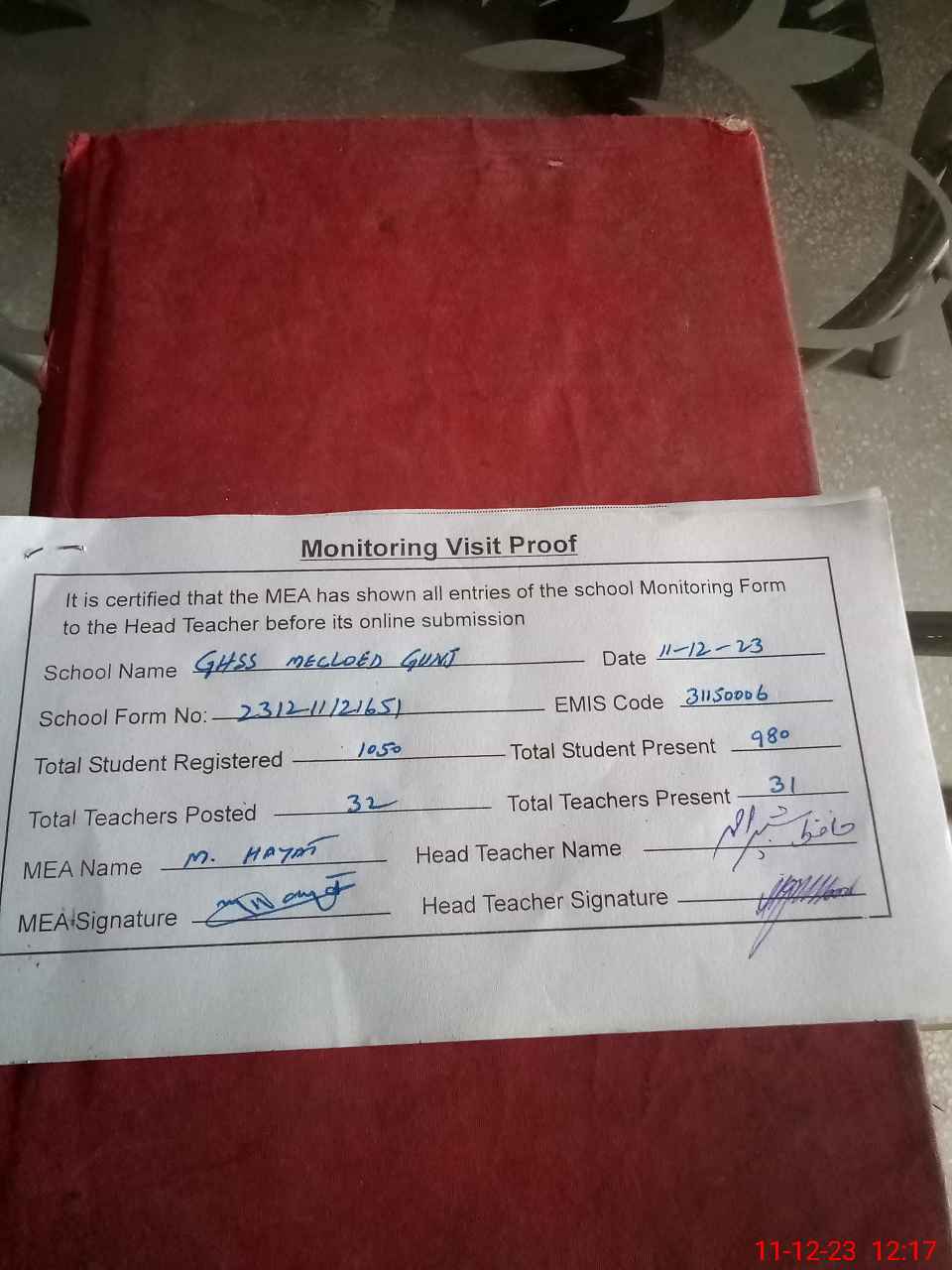 | Attendance Register | Head Teacher | MEA with School | Visit Proof |